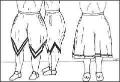 breeches went straight down from the waist, making them baggy, and were either left loose or tied at the knee. When gathered at the knee, the breeches were closer fitting than